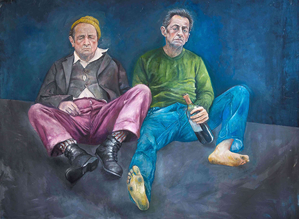 Abdalá Al Omari ha trabajado, incansable, desde su estudio de Bruselas(Bélgica), a salvo. Han sido 19 meses de labor los que este artista sirio, refugiado, ha dedicado a plasmar en sus lienzos la idea que le movía: la de retratar a los principales líderes mundiales como escapados, como exiliados, personas desplazadas o marginadas por la sociedad, como él mismo hasta que encontró acomodo, como los cinco millones de ciudadanos de su país que han escapado a los seis años de guerra. Ahora muestra el resultado de su empeño en una galería de Dubái (Emiratos Árabes Unidos), con una excelente acogida en las redes sociales, especialmente en el mundo árabe.